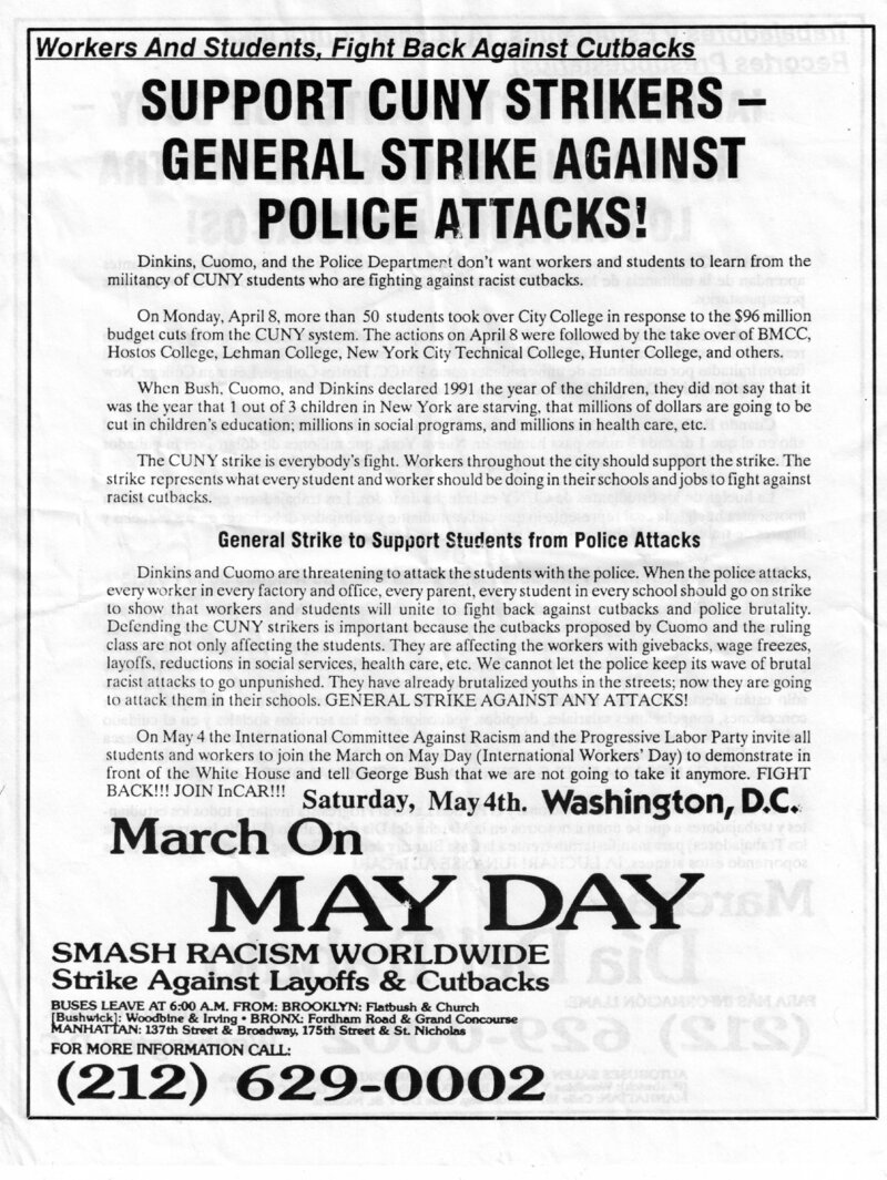 Calling for a general strike to support students, this May Day flyer argued that “When the police attack. . .workers and students will unite to fight back against cutbacks and police brutality.” Written in both Spanish and English, the flyer specifically outlined several recent student takeovers at various CUNY campuses in response to the $96 million budget cuts imposed on the CUNY system. The flyer named both Mayor David Dinkins and Governor Mario Cuomo as threatening to attack student strikers with the police. Students and workers were also invited to The Mayday march organized by the International Committee Against Racism and the Progressive Labor Party for May 4th in Washington.