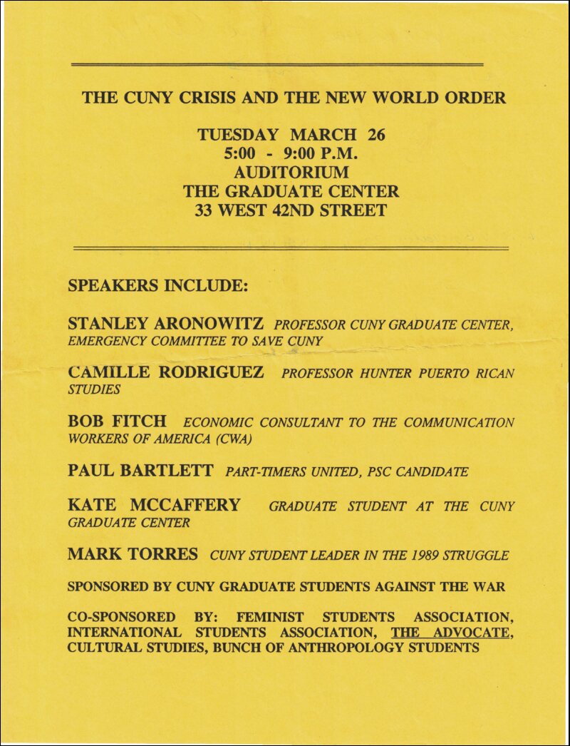 Sponsored by City University of New York (CUNY) Graduate Students Against the War, this flyer announced a symposium on “The CUNY Crisis and New World Order.” Well before the CUNY strikes of 1991, Graduate Center student organizations were already involved in discussions linking the threat of austerity measures against CUNY and the rise of neoliberalism. Speakers included Stanley Aronowitz, Camille Rodriguez, Bob Fitch, Paul Bartlet, Kate McCaffery, and Mark Torres.