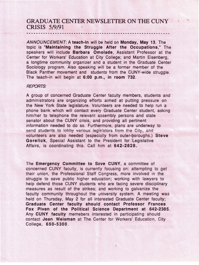 This Graduate Center Newsletter on the CUNY Crisis, published on May 9, 1991, announced a teach-in on "Maintaining the Struggle after the Occupation," which focused on organizing efforts to continue putting pressure on the New York State legislature to resist budget cuts and tuition hikes. The newsletter reported on the formation of an "Emergency Committee to Save CUNY," comprised of concerned CUNY faculty who called on their union the Professional Staff Congress (PSC) to defend students who were facing severe disciplinary measures and to "galvanize the faculty community." In addition, CUNITY, the CUNY-wide coalition of students struggling against budget cuts and tuition hikes, shared its plan for a large rally in Albany and its fight to gain amnesty for those students facing disciplinary and legal action as a result of the strikes. The newsletter also reported on CUNY Chancellor Ann Reynold's chance meeting with students that led to an agreement to meet with them before the end of the semester.