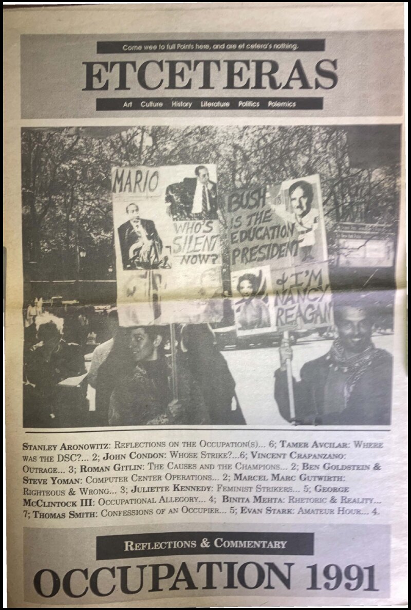 Following the Graduate Center takeover, Etceteras Vol.0 No.0 featured reflections and commentary on the "Occupation 1991," which had lasted over a week. Various students from multiple programs not actively involved in the takeover of the Graduate Center expressed their frustration, anger, and misgivings. Tamer Avcilar of the Doctoral Student Council (DSC) stated that the takeover was an "act committed by several students who were able to take advantage of a vacuum of power" and lamented the elected officials of the DSC inability to take action. Juliette Kennedy in Feminist Strikers wrote of the fear of speaking out at the daily general assemblies and the self-righteousness of the organizers, while in "Amateur Hour," Evan Stark argued that "lacking grassroots support, the building occupation defeated itself." Stanley Aronowitz, a professor in Sociology, offered a geopolitical analogy and defended the students in their actions, as he acknowledged that the intended audience was not the legislators but rather the press, who may not have responded to more traditional modes of protest. However, to Aronowitz, the event's main success was the direct democracy that was practiced and the possibility that CUNY could become a leading "innovator in pedagogy and curriculum."