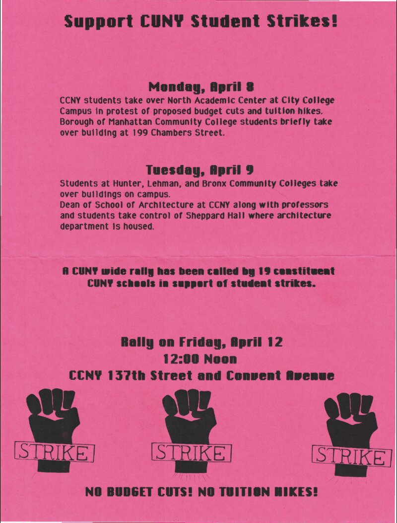 “No Budget Cuts! No Tuition Hikes!” This 1991 flyer promoted a City University of New York (CUNY) wide rally on April 12th at City College of New York (CCNY). Chronicling April 8th’s CCNY and Borough of Manhattan student takeovers; and April 9th’s Hunter, Lehman and Bronx Community College subsequent takeovers, the flyer stated that the rally had been called by 19 constituent CUNY schools in support of student strikes.