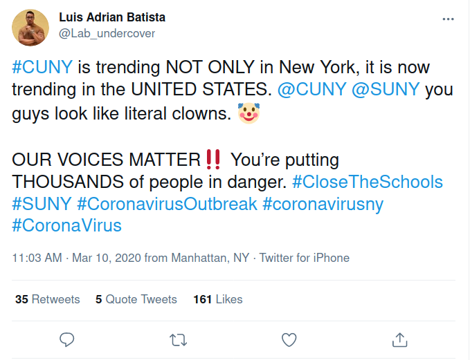 This tweet pointed out that the #CloseCUNY hashtag had received national circulation among Twitter's userbase during the early days of the pandemic. This hashtag expressed a growing desire for CUNY to cease in-person instruction, begun early in the pandemic, and became widely popular among the broader CUNY community. As its circulation suggested, the concerns raised in this tweet demonstrated CUNY's influence beyond simply the metropolitan area it inhabits geographically.