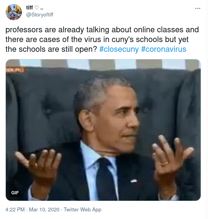 professors are already talking about online classes and there are cases of the virus in cuny's schools but yet the schools are still open? #closecuny #coronavirus https://t.co/lPYBHXHCS1