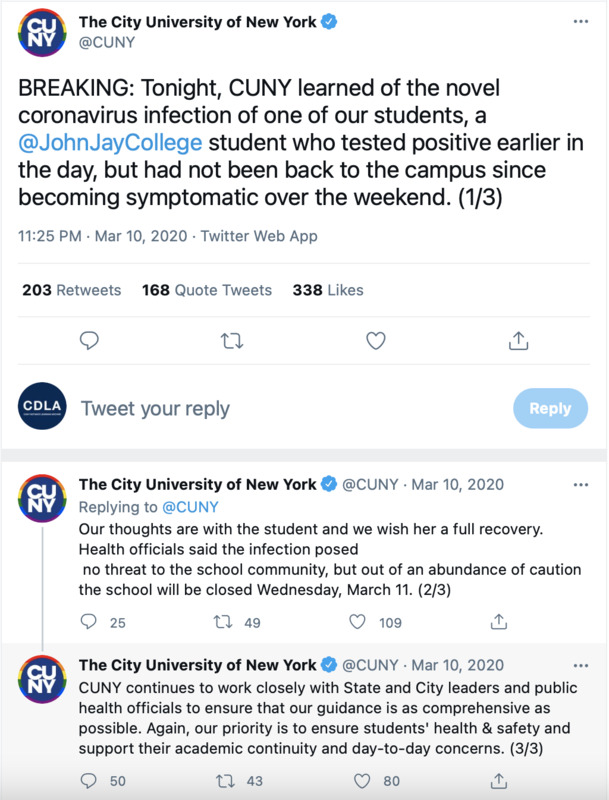BREAKING: Tonight, CUNY learned of the novel coronavirus infection of one of our students, a @JohnJayCollege student who tested positive earlier in the day, but had not been back to the campus since becoming symptomatic over the weekend. (1/3)
