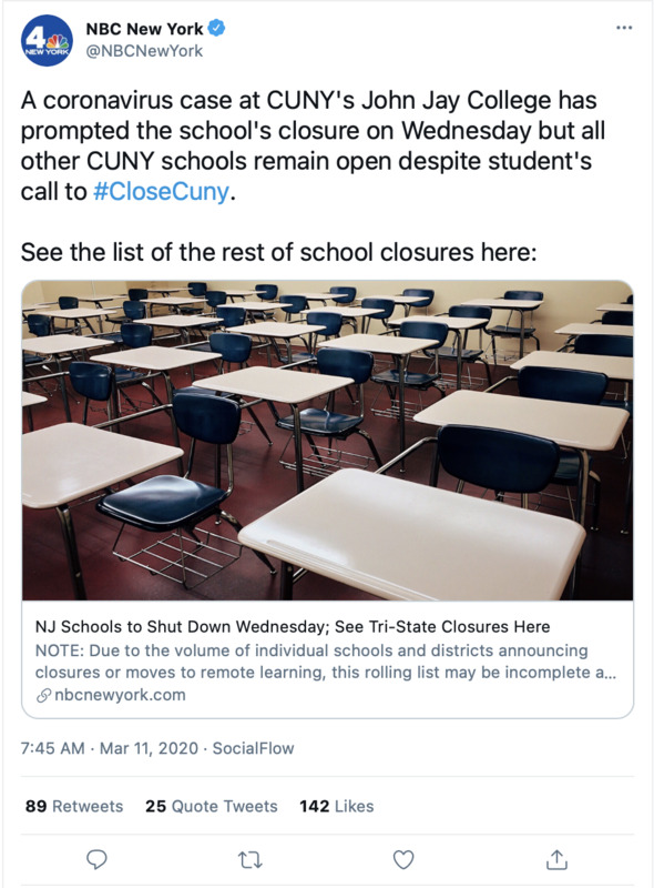 Tweet: NBC New York Report of Coronavirus Exposure at John Jay College