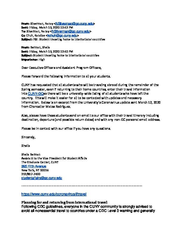 Amidst discussions of precarity, a group often absent from the conversation were international students, members of the CUNY community resident in the United States under limited political visas far from home and family. Sent on March 13, 2020, by the Office of Student Affairs at The Graduate Center, this email exemplified an initial attempt by CUNY leaders to tabulate the movement of the international student body during the early stages of the COVID-19 pandemic. The email specifically requested that students record their travels home to international countries by entering the details into CUNYGO, the university's travel registry portal.