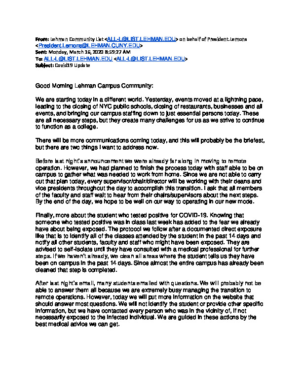 Lehman College. Letter. “Covid-19 Update (Lehman College Campus)”. Covid19 Update (Lehman Campus. COVID Exposure), CUNY DIGITAL HISTORY ARCHIVE, accessed March 10, 2026, https://stephenz.tailc22a4b.ts.net/s/cdha/item/1816