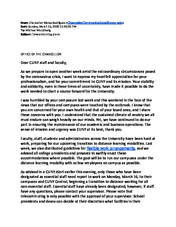 Released on March 15, 2020, this email represented an official communication from City University of New York (CUNY) Chancellor Matos Rodriguez on university guidelines, expectations, and intent to set up telecommunications for CUNY's operations. In this lengthy email, we again see the unique balance of conciliation and professionalism that the CUNY administration had attempted to convey throughout the pandemic. While we are typically used to separating questions of logistics and human effect, the creation of online learning systems during the pandemic revealed such concerns to be hardly disparate.