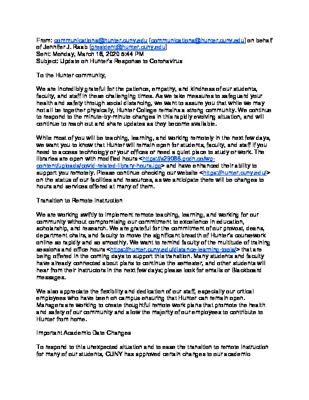 Hunter College. Letter. “Update on Hunter’s Response to Coronavirus.”, CUNY DIGITAL HISTORY ARCHIVE, accessed March 10, 2026, https://stephenz.tailc22a4b.ts.net/s/cdha/item/1818