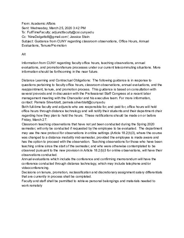 Sent to faculty on March 25, 2020, from the Office of Academic Affairs at CUNY's College of Staten Island (CSI) to faculty, this email offered administrative responses to looming questions at the center of City University of New York's (CUNY) "current telecommuting situation," with guidance related to office hours, teaching observations, annual evaluations, as well as reappointment, tenure, and promotion practices. The email also highlighted the subject of "Distance Learning and Contractual Obligations" for departments to conduct classroom observations of faculty instruction before describing updated expectations, logistics, and protocol pertaining to these issues.