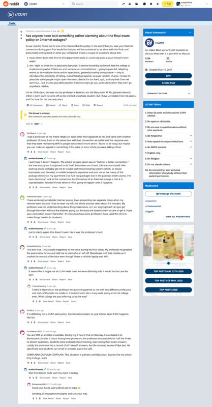 This Reddit thread, posted on April 2, 2020, documented one student's concerns over the assessment policies of their class if they were to suffer a network outage and were unable to complete a given test as a result of such connectivity concerns.