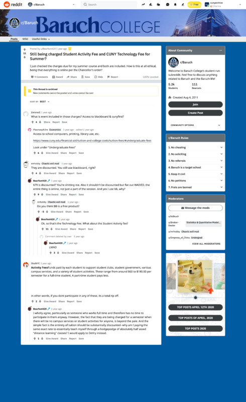 Anonymous. “‘Still Being Charged Student Activity Fee and CUNY Technology Fee for Summer?’”. Reddit. https://www.reddit.com/r/Baruch/comments/g09vil/still_being_charged_student_activity_fee_and_cuny/, CUNY DIGITAL HISTORY ARCHIVE, accessed March 10, 2026, https://stephenz.tailc22a4b.ts.net/s/cdha/item/1916