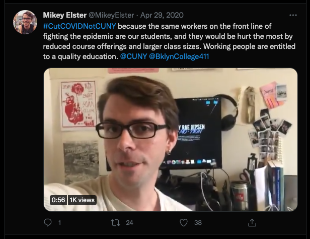 This tweet, posted in April 2020 by a CUNY adjunct lecturer, called attention to CUNY students' roles as frontline workers in the pandemic. This point is significant in the discussion of cuts at CUNY affecting students and the broader community. It showed how the CUNY community and especially its students are inextricably tied to the proper functioning of the city.