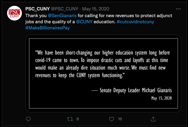 Tweet: Thank you @SenGianaris for calling for new revenues to protect adjunct jobs and the quality of a @CUNY education.