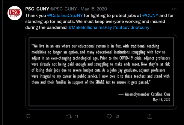 Thank you @CatalinaCruzNY for fighting to protect jobs at @CUNY and for standing up for adjuncts. We must keep everyone working and insured during the pandemic! #MakeBillionairesPay #cutcovidnotcuny https://t.co/zmaYLTF2j0