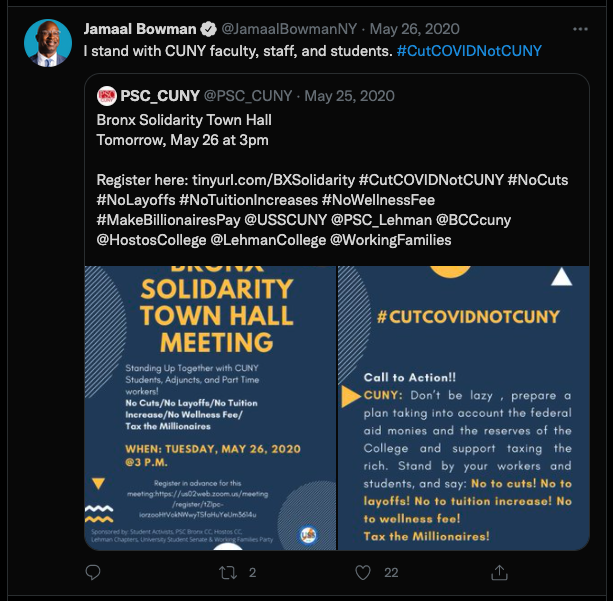 This tweet, posted in May 2020 by US Representative Jamaal Bowman, is an indication of an expression of solidarity for CUNY at the federal level.