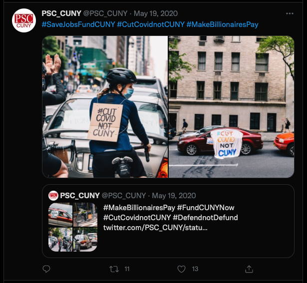 PSC. “Tweet: #SaveJobsFundCUNY #CutCovidnotCUNY #MakeBillionairesPay”. Twitter. https://twitter.com/PSC_CUNY/status/1262859228869517317, CUNY DIGITAL HISTORY ARCHIVE, accessed March 10, 2026, https://stephenz.tailc22a4b.ts.net/s/cdha/item/1945