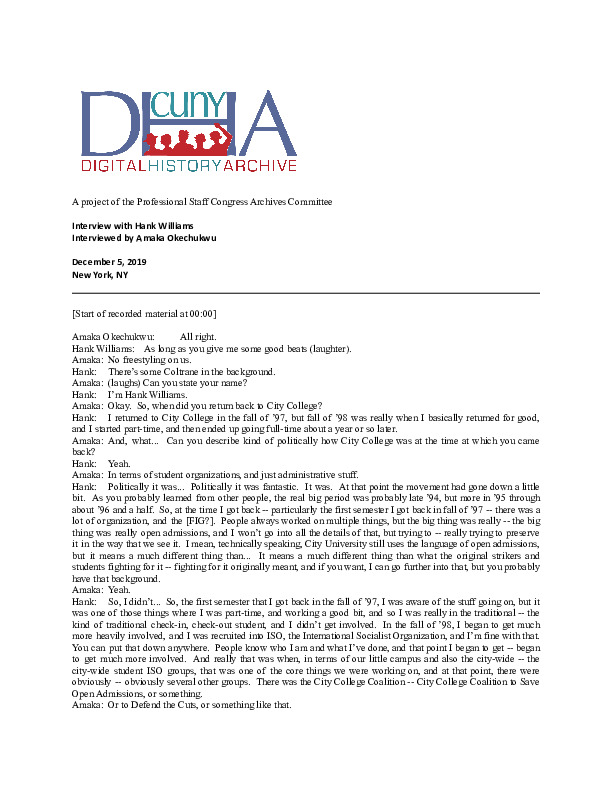 HANK WILLIAMS: So, I didn’t... So, the first semester that I got back in the fall of ’97, I was aware of the stuff going on, but it was one of those things where I was part-time, and working a good bit, and so I was really in the traditional -- the kind of traditional check-in, check-out student, and I didn’t get involved. In the fall of ’98, I began to get much more heavily involved, and I was recruited into ISO, the International Socialist Organization, and I’m fine with that. You can put that down anywhere. People know who I am and what I’ve done, and that point I began to get -- began to get much more involved. And really that was when, in terms of our little campus and also the city-wide -- the city-wide student ISO groups, that was one of the core things we were working on, and at that point, there were obviously -- obviously several other groups. There was the City College Coalition -- City College Coalition to Save Open Admissions, or something.