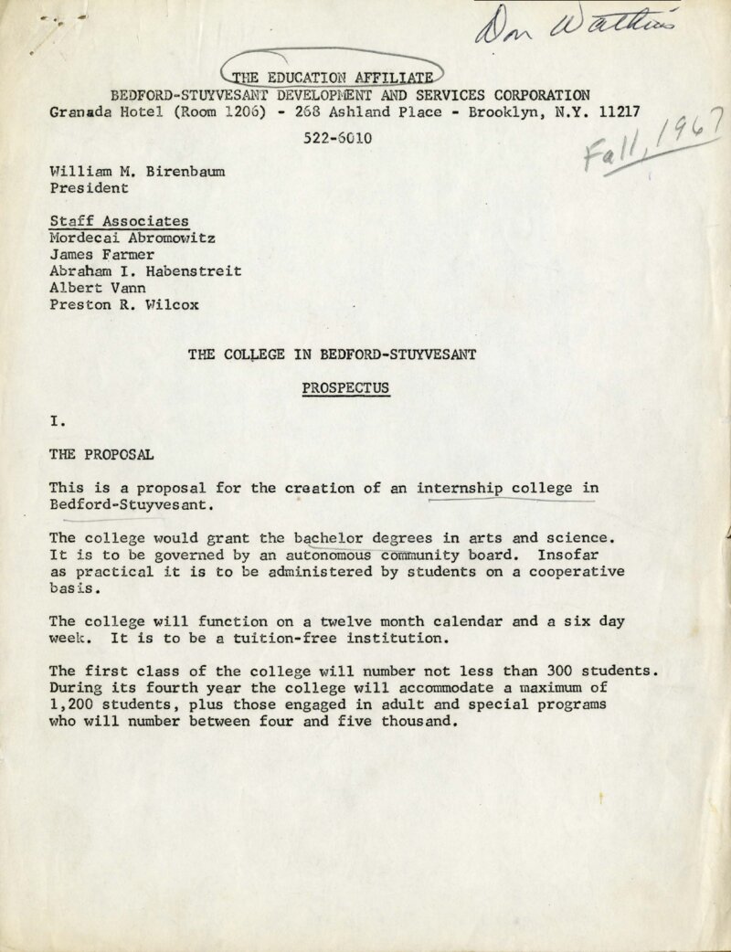 Drafted in 1967, the Educational Affiliate, The College in Brooklyn: Prospectus, the work of the Affiliate had been inspired and supported by Senator Robert F. Kennedy. Staff of the Educational Affiliate included William Birenbaum, President, and “Staff Associates" Al Vann, James Farmer, Preston R. Wilcox, and several others. The document was headlined as a “proposal for an Internship college” and outlined a vision that included several characteristics for the proposed college that remained fundamental to the community control leaders’ demands for "Community College 7," CUNY's proposed new college in Central Brooklyn. Among these demands were free tuition and specific programs for teacher education and nursing. The language used and the programs proposed implied or assumed a four-year CUNY college would be developed.