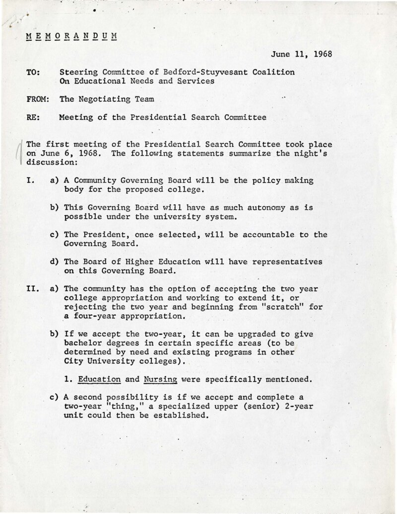 On June 6, 1968, a Presidential Search Committee comprised of five representatives from Bedford-Stuyvesant and five officials of the City University of New York (CUNY) met to discuss how they would collaborate to plan and lead a new public college in Central Brooklyn. In this memo, the Negotiation Team appointed by the Bedford-Stuyvesant Coalition on Educational Needs and Services (B-SCENS), a network of education advocacy groups and community-based organizations, outlined agreements reached with CUNY officials with respect to how the community would be represented in planning and leading the new college. Also discussed at this meeting was the key question of whether Community College 7 would be a “junior,” two-year degree granting college )as originally proposed by CUNY officials) or a “senior,” four-year degree granting college as demanded by the B-SCENS.