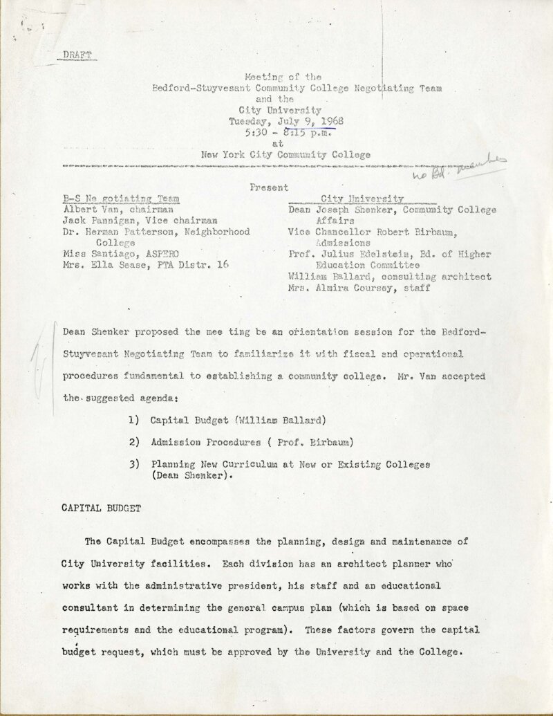 On July 9, 1968, the Presidential Search Committee for “Community College 7,” composed of five City University of New York officials and five appointed representatives of Bedford-Stuyvesant’s community-based organizations, met to discuss plans for the new college. In this meeting, CUNY officials briefed the Bedford-Stuyvesant committee members in detail on pathways and obstacles for the college to open as a four-year degree granting “senior” college, as demanded by the Central Brooklyn community. The Committee also explored possibilities for the Bedford-Stuyvesant community organizations to receive funds to support their research and planning activities in support of the new college, an issue that would prove contentious in the coming weeks with the Ford Foundation’s involvement in funding the project.
