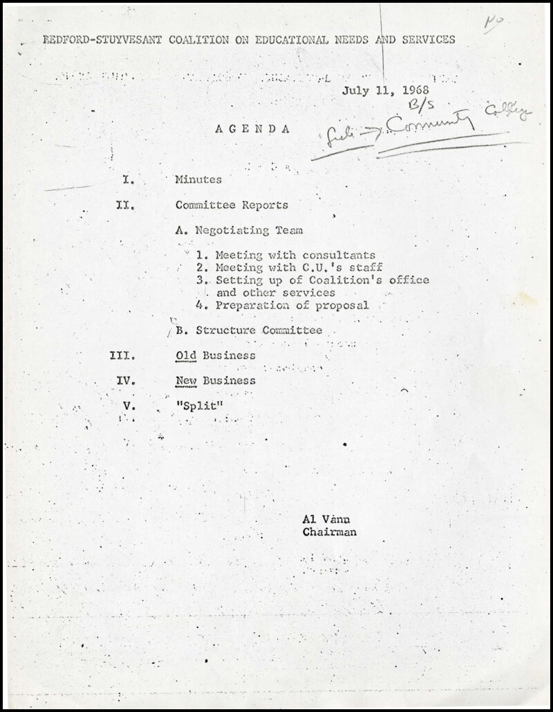 In February 1968, the City University of New York (CUNY) announced plans to establish a new “Community College 7 in or near Bedford-Stuyvesant. . . oriented to the Bedford-Stuyvesant Community and operated in consultation with the community.” Representatives of a broad network of Central Brooklyn community organizations engaged in an 18 months-long negotiation with CUNY Board of Higher Education officials over CUNY’s plans for its newly announced “Community College 7,” including discussions about the proposed school’s curriculum, who would lead it, and what role the community would play in the school’s governance. The role of the Bedford-Stuyvesant community in planning and determining the leadership of the college remained a central point of controversy between Central Brooklyn’s educational and civil society leaders and CUNY officials in the negotiations that followed.