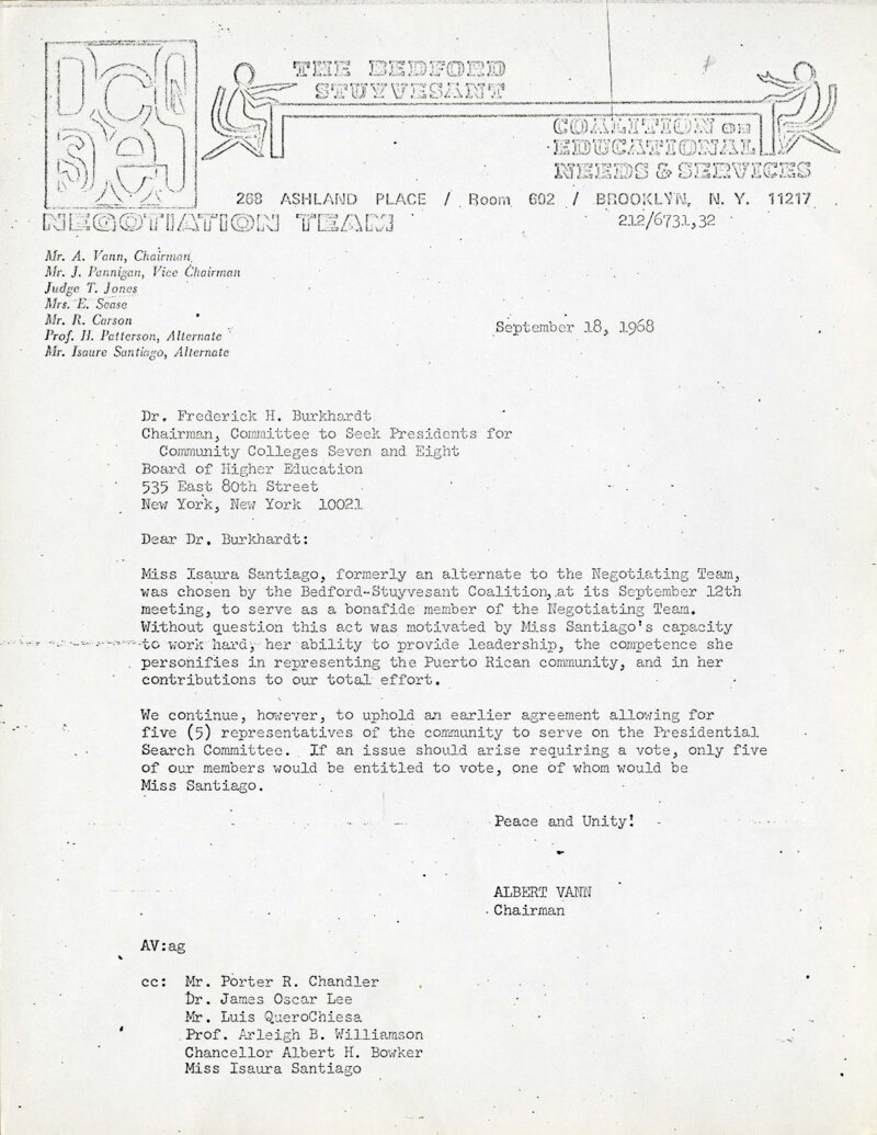 On September 18, 1968, Al Vann, Chairman of the Negotiation Team and Steering Committee of the Bedford-Stuyvesant Coalition on Educational Needs and Services (B-SCENS), wrote to Frederick Burkhardt, Chairman of the New York City Board of Higher Education, to describe the Bedford-Stuyvesant community’s vision for the way a new public college planned for Central Brooklyn should be “different.” In this letter, Vann wrote to Burkhardt, who served as chairman of the Committee to Seek Presidents for Colleges VII and VIII (a committee on which Vann also served as a member), emphasizing that the “difference we seek will be profound, and will be measured by the relevancy the college will have to our community and how well we meet some of our community’s needs.” Vann's letter also detailed important aspects of the community’s proposed role in making plans and decisions for the proposed college.