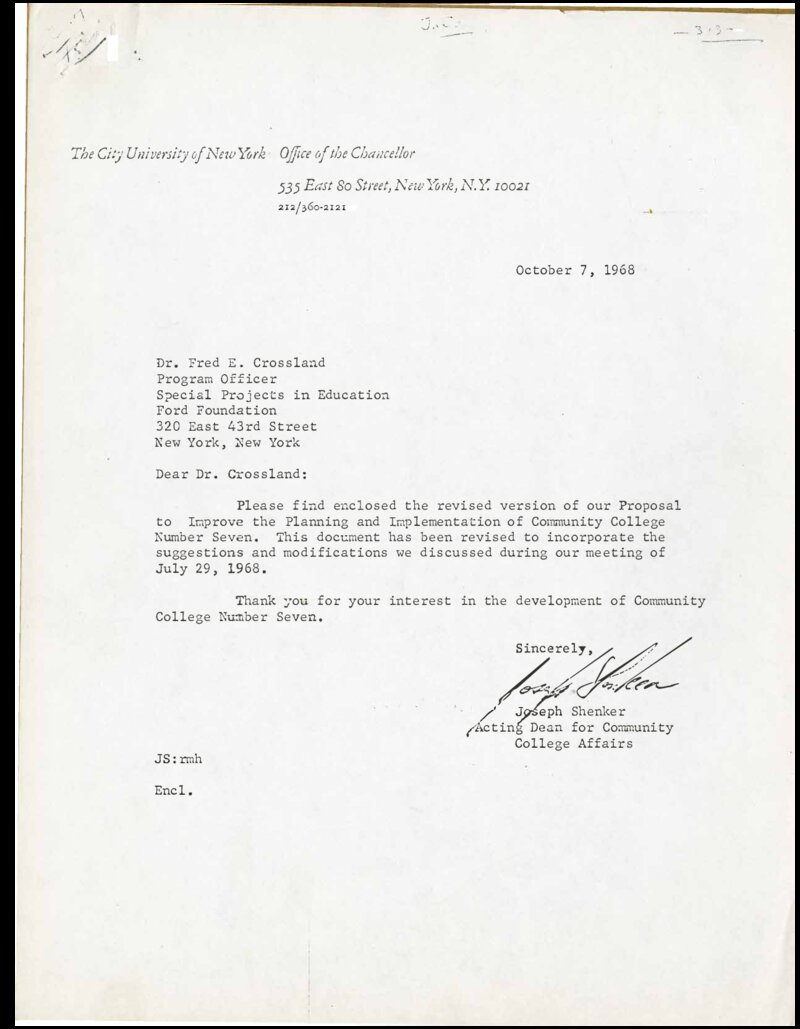 Shenker, Joseph. Letter. “October 7, 1968, Proposal to Improve the Planning and Implementation of Community College 7.”, CUNY DIGITAL HISTORY ARCHIVE, accessed March 10, 2026, https://stephenz.tailc22a4b.ts.net/s/cdha/item/2021