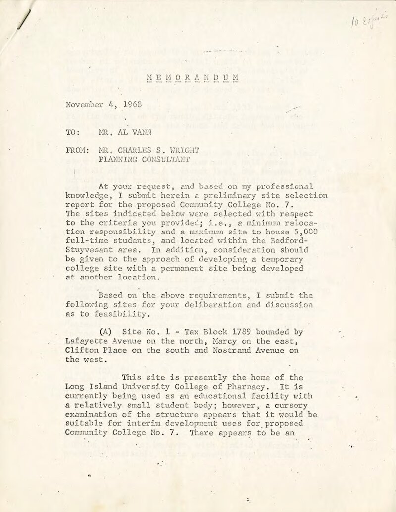 On November 4, 1968, Charles Wright, Planning Consultant to the Bedford-Stuyvesant Coalition on Educational Needs and Services (B-SCEN) submitted a memo to Al Vann, chairman of the Negotiation Committee detailing four possible sites he had identified for the establishment of Community College 7. The location of the college was of central concern to the Bedford-Stuyvesant community, which had been publicly advocating for many years for a CUNY college to be located in Central Brooklyn, where it would be accessible to local Black and Puerto Rican youth. For reasons not documented in this collection, none of the four Bedford-Stuyvesant sites was selected for what became Medgar Evers College, which was ultimately built in the adjacent neighborhood of Crown Heights.