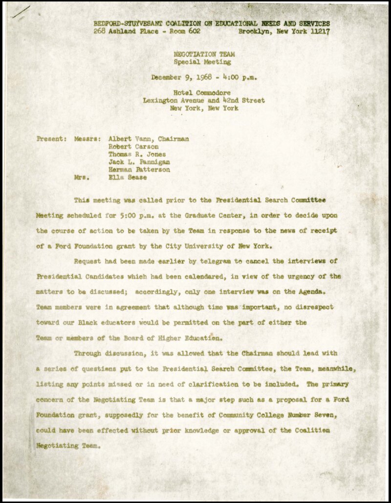 On December 9, 1968, in its second Special Meeting in less than a week, the five-member Negotiation Team of the Bedford-Stuyvesant Coalition on Educational Needs and Services met to discuss their concerns that City University of New York (CUNY) officials with whom they had been collaborating to plan Community College 7 were making key decisions without consulting them as representatives of the Central Brooklyn community. At issue was news that CUNY officials had submitted a proposal for a $440,000 grant from the Ford Foundation to support the planning and establishment of Community College 7. In minutes from the meeting, the Negotiation Team noted their “primary concern. . .that a major step, such as a proposal for a Ford Foundation grant, supposedly for the benefit of Community College 7, could have been effected without prior knowledge or approval of the Coalition Negotiation Team.” Tensions and mistrust between the Bedford-Stuyvesant and CUNY representatives involved in planning Community College 7 would continue to escalate in the coming weeks.