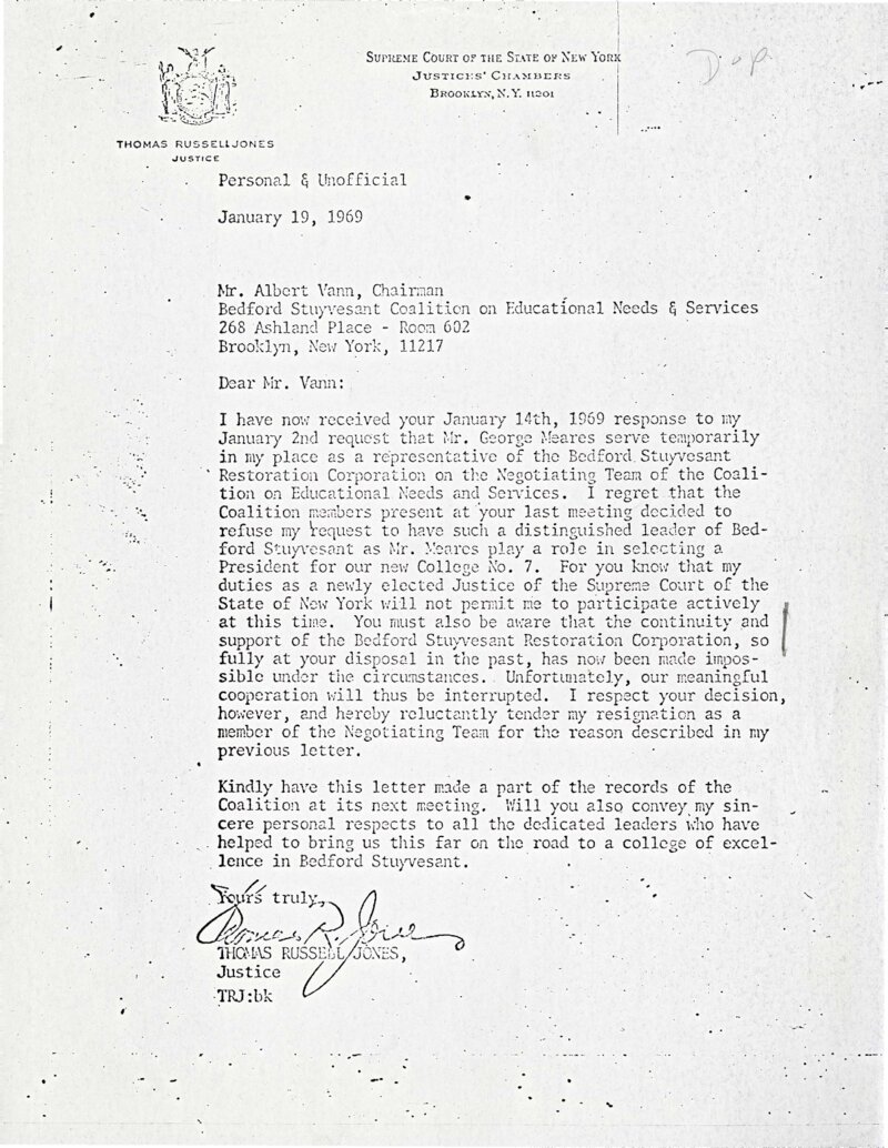 On January 19, 1969 New York State Justice Thomas Jones wrote to Al Vann, Chairman of the Bedford-Stuyvesant Coalition for Educational Needs and Services (B-SCENS), resigning from his position as a member of the five-member Negotiation Team appointed to represent the Bedford-Stuyvesant community in plans and negotiations with City University of New York (CUNY) officials for Community College 7. Jones’s resignation letter marked the culmination of his correspondence with Vann over the past month, in which he had initially proposed to appoint a proxy to the Negotiation Team, a suggestion Vann rejected on procedural grounds. Although Jones apparently resigned from the Negotiation Team in this letter, he remained directly involved in public discussions about Community College 7, and was a key actor in a conflict that developed in the coming weeks between Bedford-Stuyvesant community leaders over plans for the new college.