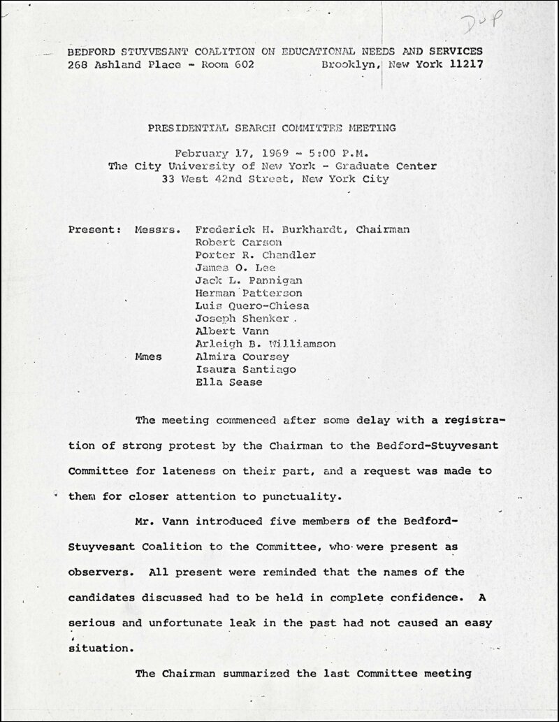Bedford Stuyvesant Coalition on Educational Needs and Services. Letter. “Minutes of the February 17, 1969 Meeting of the Presidential Search Committee for Community College 7.”, CUNY DIGITAL HISTORY ARCHIVE, accessed March 10, 2026, https://stephenz.tailc22a4b.ts.net/s/cdha/item/2036
