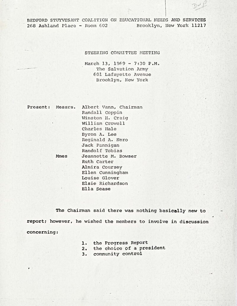 March 13, 1969 Minutes of the Steering Committee of the Bedford-Stuyvesant Coalition on Educational Needs and Services: