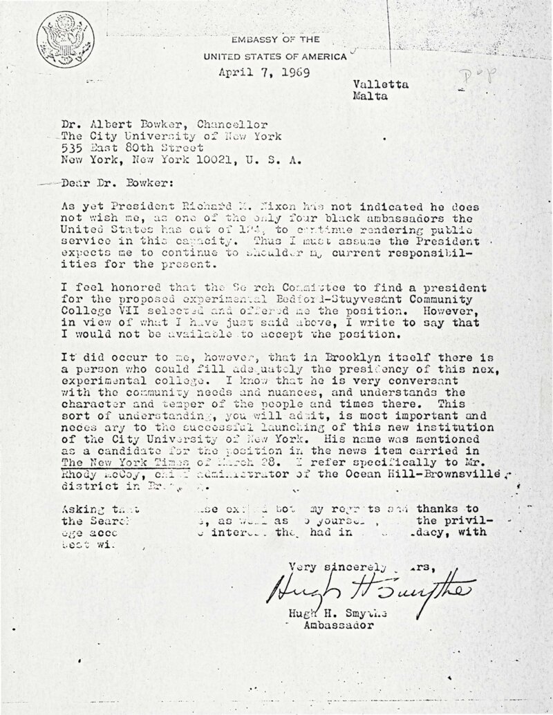 On April 7, 1969, Hugh Smythe, United States Ambassador to Malta, wrote to Dr. Albert Bowker, Chancellor of the City University of New York (CUNY) declining his offer of the position of president of Community College 7. Smythe specifically recommended that the Presidential Search Committee consider Rhody McCoy, then Unit Administrator of the experimental Ocean-Hill Brownsville School district, whose role in that struggle would soon become the flashpoint for a controversy that shaped the fate of the new college.