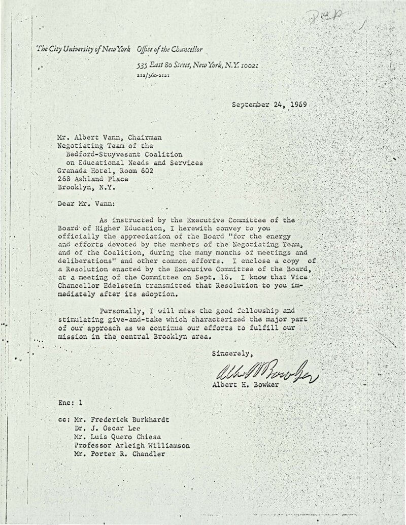 On September 24, 1969, Albert Bowker, Chancellor of the City University of New York (CUNY) wrote to Al Vann, a community leader of Bedford-Stuyvesant, formally informing him of the Board of Higher Education’s Resolution eight days before to dissolve the Presidential Search and Planning Committee for Community College 7, of which Vann had been a member. In his letter, Bowker reiterated words of thanks included in the resolution for the “energy and efforts” of the Bedford-Stuyvesant Coalition on Educational Needs and Services (B-SCENS) and its delegated Negotiation Team in negotiations and plans for Community College 7, and shared his personal appreciation with Vann for the “good fellowship and stimulating give-and-take” in their collaboration.