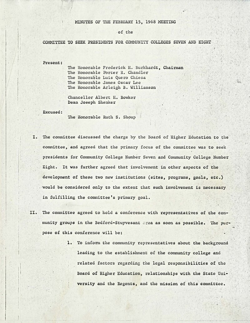 On February 15, 1968, seven City University of New York (CUNY) officials met to discuss their role and responsibilities as the Committee to Seek Presidents for Community Colleges Seven and Eight. The Committee agreed that their “primary focus… was to seek presidents” for the two new colleges, and that they would also consult with community organizations in Bedford-Stuyvesant, the announced location for Community College 7 and that two or three community delegates might “sit with the committee. . .with the same privileges afforded to faculty members who have been invited to participate by other Board [of Higher Education] presidential search committees.” In the coming weeks, Bedford-Stuyvesant community leaders successfully advocated for the committee's expansion to include five community representatives, balanced by an equal number of five CUNY officials.