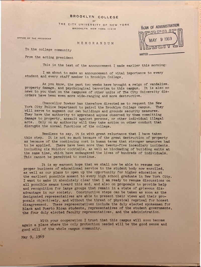 On May 9, 1969 Acting Brooklyn College (BC) President George Peck announced the role of the NY Police Department in response to the student-led movement at. The document described various protest strategies and acts of civil disobedience coordinated by members of the student body. The Acting President also commented on plans to implement CUNY's open admissions policy to provide college admission for every graduate of New York City high schools.