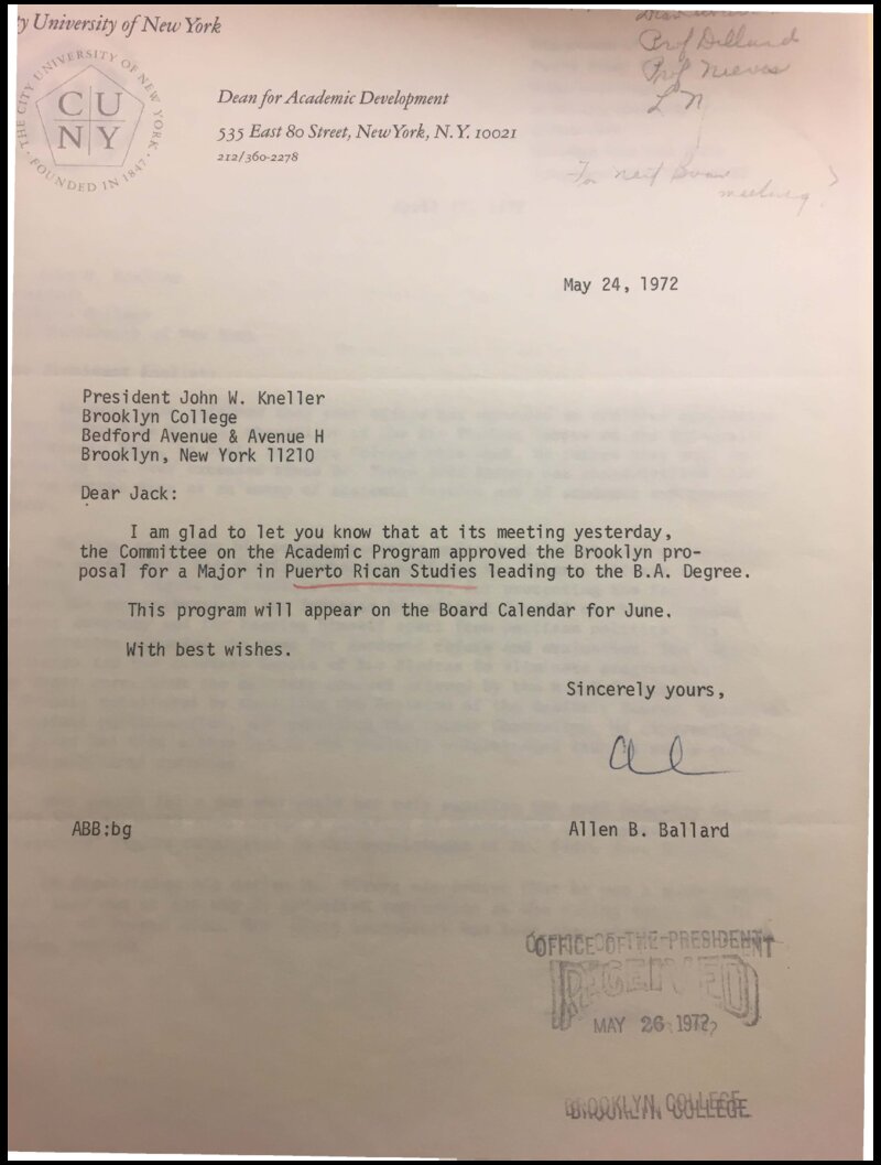 Ballard, Allen B. Letter. “May 24, 1972 Letter from Brooklyn College President John Kneller Confirming Approval of the Puerto Rican Studies Major at the College”. 14122, CUNY DIGITAL HISTORY ARCHIVE, accessed March 10, 2026, https://stephenz.tailc22a4b.ts.net/s/cdha/item/2129