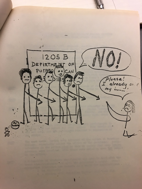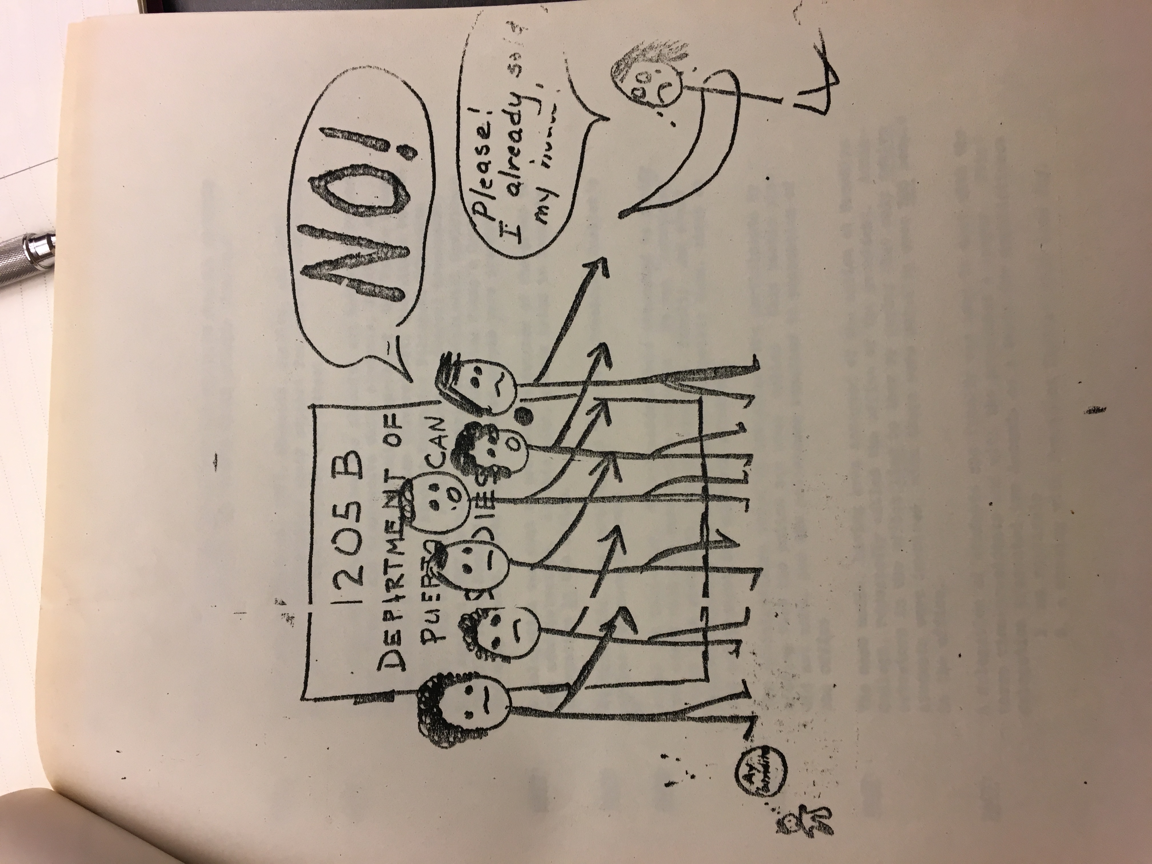 A drawing illustrating how Puerto Rican student activists at Brooklyn College (BC) imagined themselves guarding the Department of Puerto Rican Studies in protest of President John Kneller's decision in 1974 not to hire María Sánchez as the Department of Puerto Rican Studies chairperson.