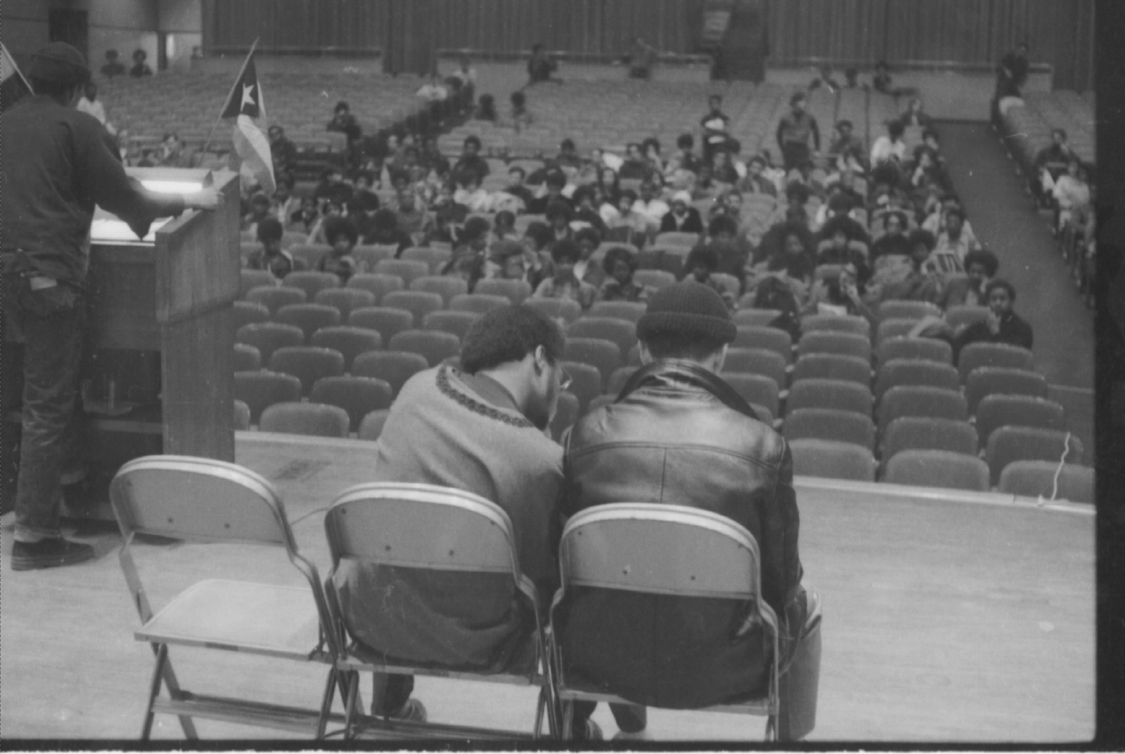 This photo, taken by pioneering student-activist Antonio "Tony" Nieves, member and liaison of the Brooklyn League of Afro-American Collegians (B.L.A.C.) and the Puerto Rican Alliance (P.R.A.) at Brooklyn College (BC). shows Orlando Pile (deated on stage in the middle chair), former president of B.L.A.C at the Malcolm X Day and Memorial at the college in 1969. At the podium is Askia Davis, member of the Black Panther Party and student member of B.L.A.C.