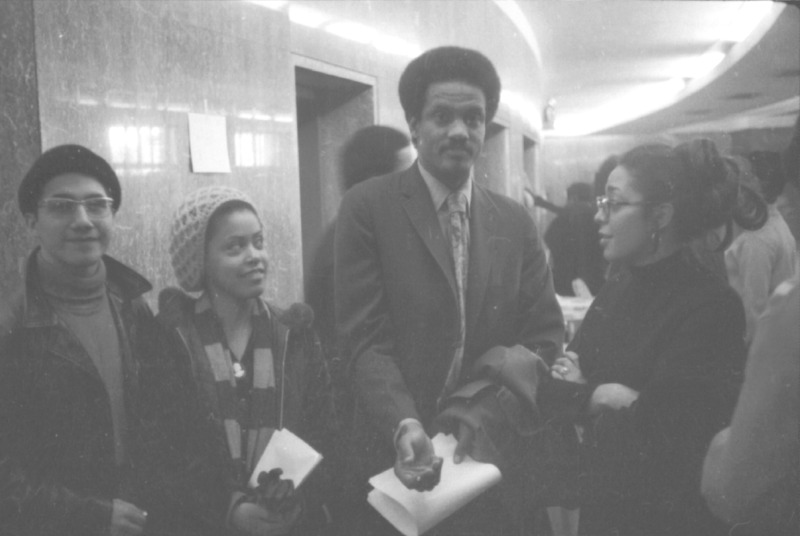 This photo, taken by pioneering student-activist Antonio "Tony" Nieves, a member and liaison of the Brooklyn League of Afro-American Collegians (B.L.A.C.) and the Puerto Rican Alliance (P.R.A.) at Brooklyn College (BC), depicts: (left to right) Black Panther Party, B.L.A.C. and P.R.A. member, Ray Aviles; P.R.A. member Ruth Ramos; Professor Carlos E. Russell; and P.R.A. member Dylcia Pagan. Pagan would later became a political prisoner for her role as a Puerto Rican Nationalist fighting for the independence of Puerto Rico in the U.S. before receiving clemency from President Bill Clinton in 1999. BC students and faculty are gathered for the Malcolm X Day and Memorial event at BC in 1969.