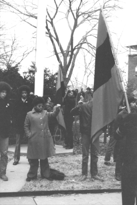 This photo, taken by pioneering student-activist Antonio "Tony" Nieves, member and liaison of the Brooklyn League of Afro-American Collegians (B.L.A.C.) and the Puerto Rican Alliance (P.R.A.) at Brooklyn College (BC), shows B.L.A.C. member Larry Sparks as he raised the Black Liberation flag on the flagpole located at the East Quad on campus during the 1969Malcolm X Day and Memorial event on the BC campus. Also shown are student members of P.R.A., and B.L.A.C. standing guard so no one disrupted the event or would touch the Puerto Rican and Black Liberation flags raised at the center of the campus.