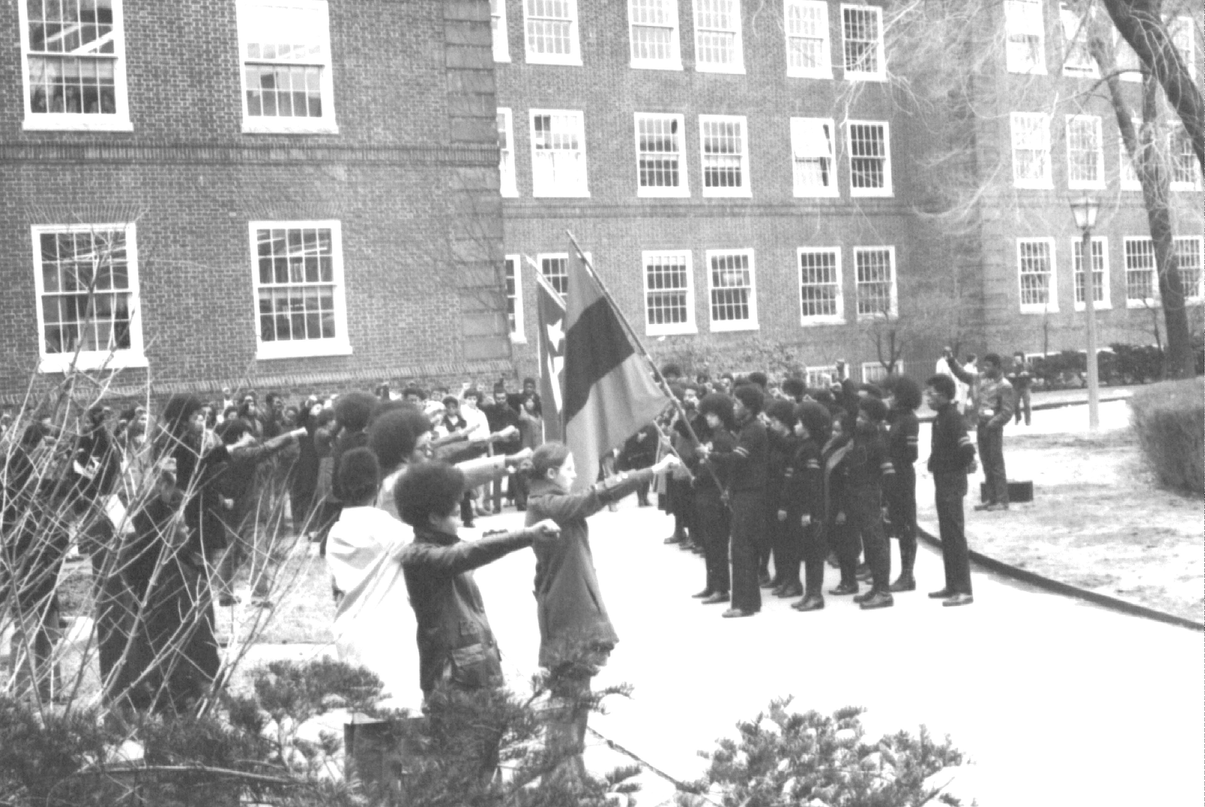 This photo, taken by pioneering student-activist Antonio "Tony" Nieves, member and liaison of the Brooklyn League of Afro-American Collegians (B.L.A.C.) and the Puerto Rican Alliance (P.R.A.), shows members of both P.R.A. and B.L.A.C. at the 1969 flag raising ceremony during the Malcolm X Day and Memorial event on Brooklyn College (BC) campus. Event organizers and attendees can be seen saluting the Puerto Rican and Black Liberation flags prior to raising them on the campus flagpole, located in front of the BC library and the President's office. According to Nieves, students were saluting and supporting "Power to the People," Independence, and the struggle for Civil Rights.
