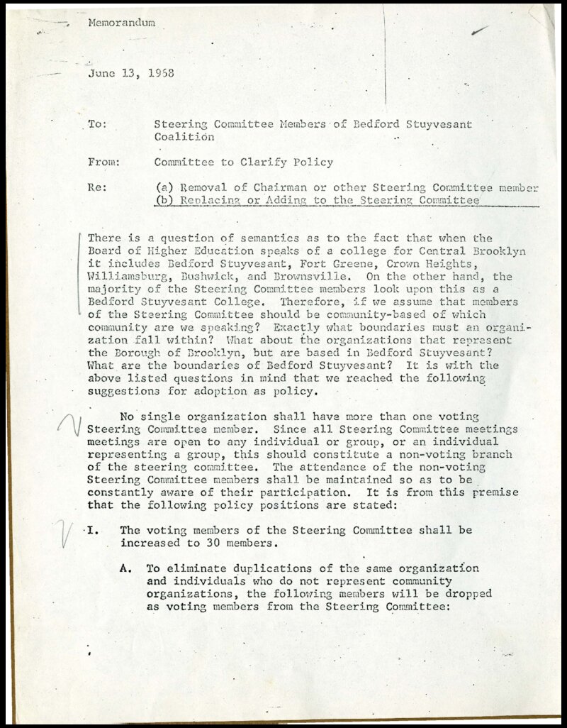 Committee to Clarify Policy, Bedford-Stuyvesant Coalition on Educational Needs and Services. Letter. “Committee to Clarify Policy Memo, June 13, 1968.”, CUNY DIGITAL HISTORY ARCHIVE, accessed March 10, 2026, https://stephenz.tailc22a4b.ts.net/s/cdha/item/2157