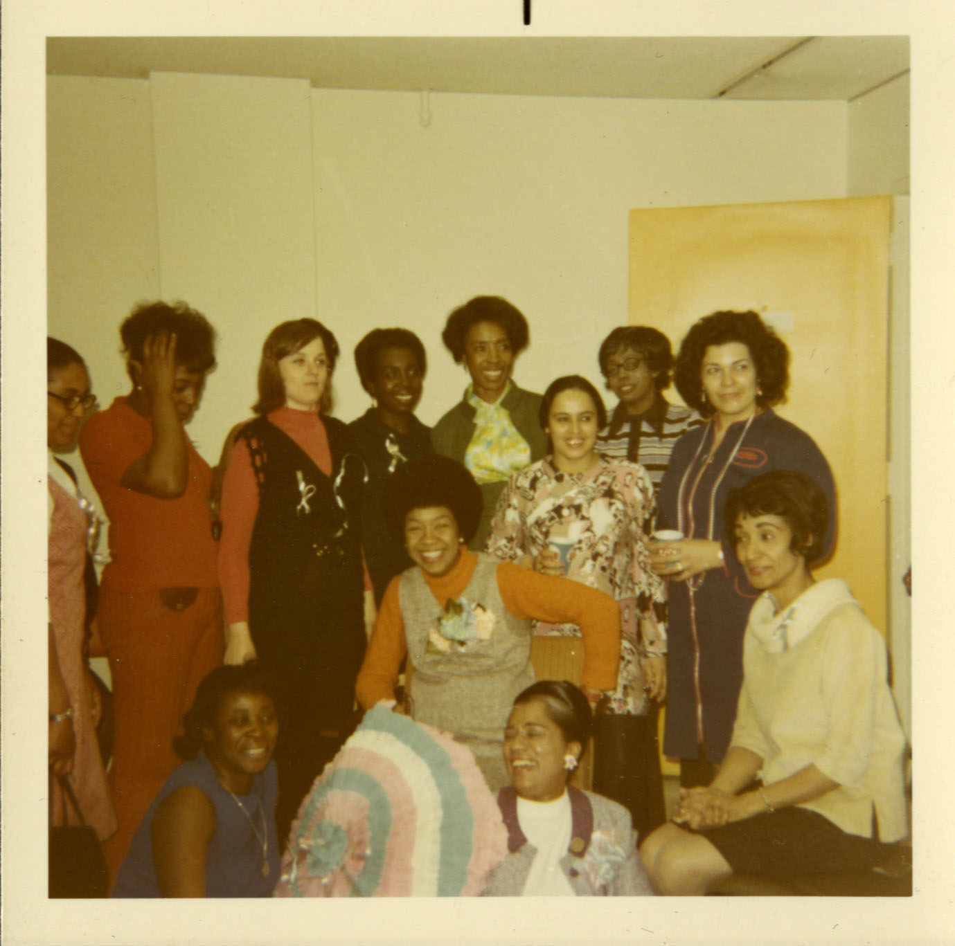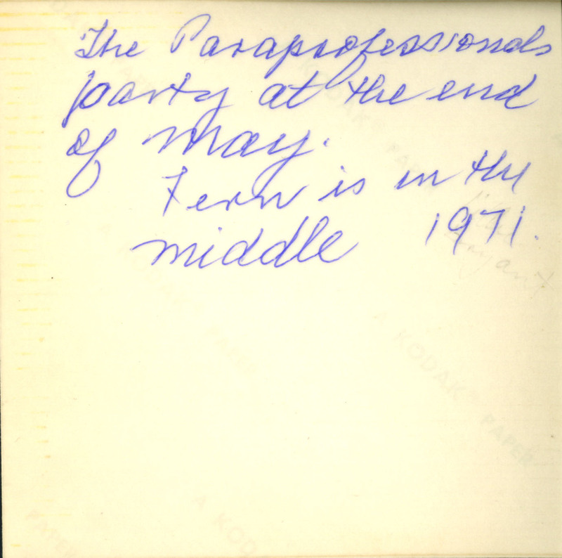 Fern Khan (at center of photo) and her students who were the first group of students to enroll at LaGuardia. These students were paraprofessionals employed by the Board of Education. The program was funded following an agreement between the United Federation of Teachers union and the Board of Education as a Career Ladder program to move paraprofessionals into teaching or social work.