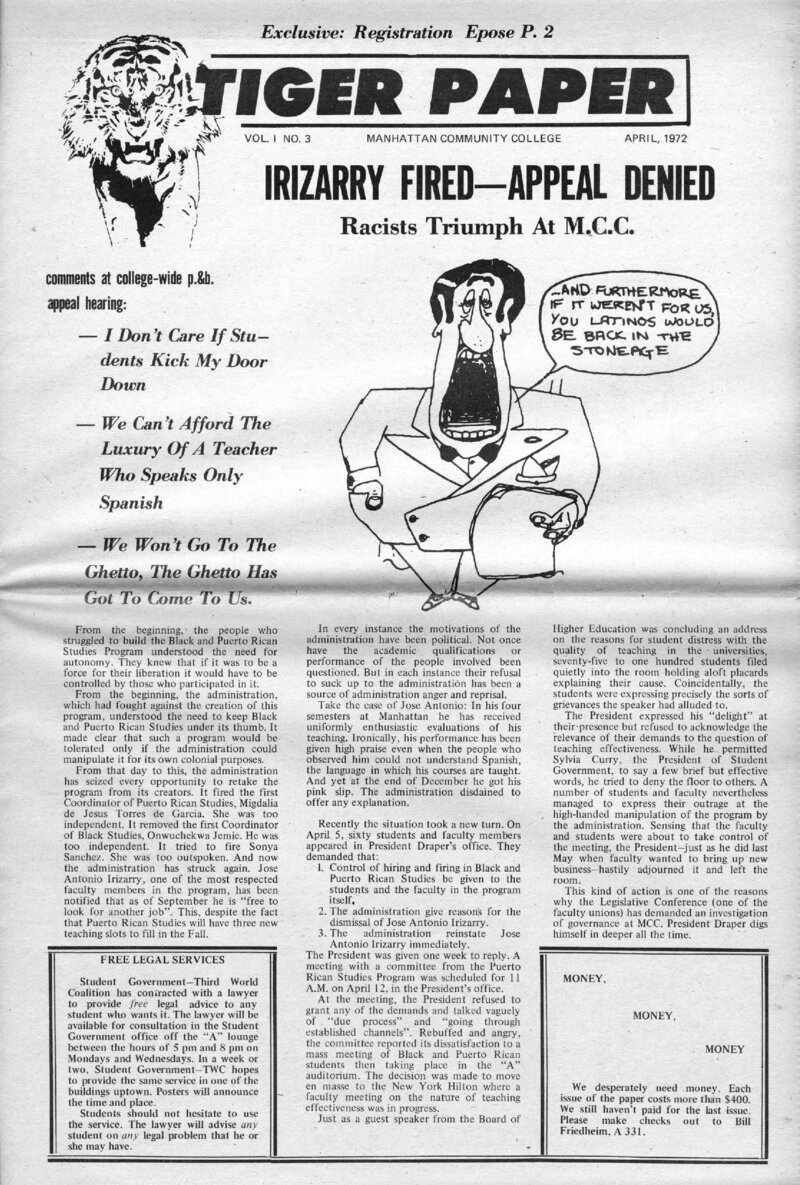 This edition of the Tiger Paper includes: interviews with BMCC students who were veterans of the Vietnam War, criticism of the college's registration process, a front page article detailing the firing of a professor, and an interview regarding recent developments in China.The Tiger Paper, which billed itself as "Manhattan Community College's only underground newspaper," was published between 1971 and 1974 by a group of radical faculty members at BMCC. The paper, whose name was a play on the quip of Mao Tse-tung that "U.S. imperialism is a paper tiger," addressed struggles both internal and external to the college while emphasizing the connections between them.