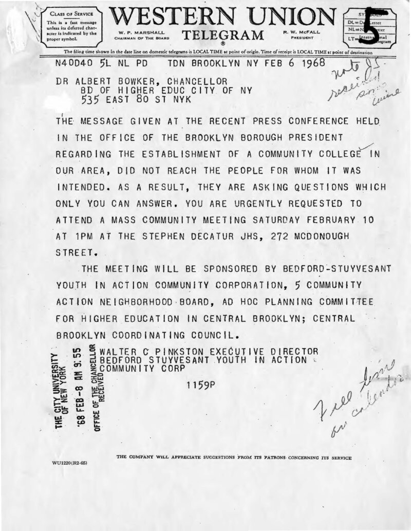 In this telegram sent to Chancellor Albert Bowker on February 6, 1968, Walter Pinkston, executive director of Bedford Stuyvesant Youth in Action, decries the recent announcement of Community College No. 7 because the message was delivered without any consideration given to the community. Pinkston "urgently request[s]" that the chancellor attend a meeting that Saturday, February 10, at Decatur JHS to meet with and hear the concerns of a variety of community groups in the neighborhood. Though the chancellor would not attend the meeting, Bowker would shortly reaffirm his commitment to community involvement. Throughout the development of Medgar Evers College, the Bedford-Stuyvesant community would maintain an active, if sometimes contentious, role in the creation of the institution.