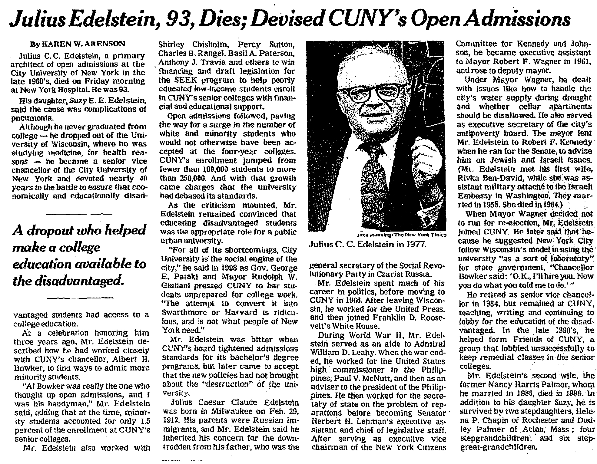 This New York Times obituary describes the career of former Vice-Chancellor Julius C. C. Edelstein, one of the primary architects of the open admissions policy at CUNY.