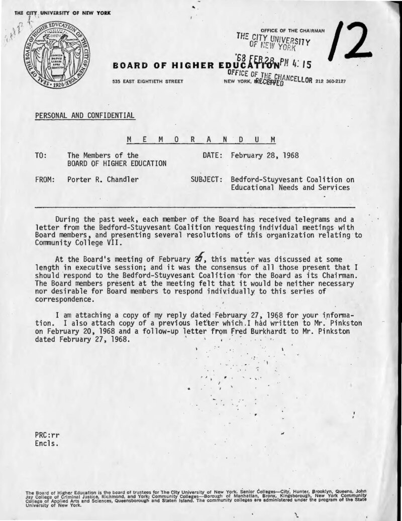 This message from Porter R. Chandler to members of the Board of Higher Education states that although each member of the Board has received requests from the Bedford-Stuyvesant Coalition for individual meetings, the members should disregard the invitations in favor of a unified response from Chandler, the Board chairman.