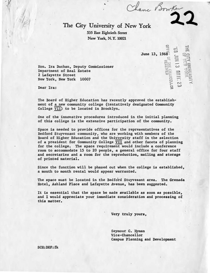 Letter from Seymour Hyman, Vice Chancellor of Campus Planning & Development, to Ira Duncan, Deputy Commissioner of the Department of Real Estate, requesting temporary space in the Bedford Stuyvesant Community for the members to confer and develop plans for the new college (Medgar Evers College) and to meet with the community-at-large.